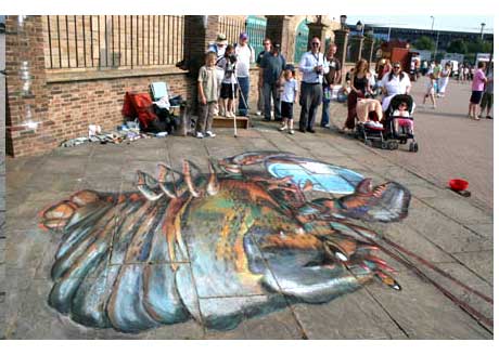 His works are whimsical and entertaining and anyone passing by on the street corner can see them. He does it because he loves peoples' reactions to his drawings, not for money or for fame. My favorite thing about this is that he does it because he loves doing it. His ideas are always so creative as well. he does a lot with things falling into holes in the sidewalk and they're always entertaining.